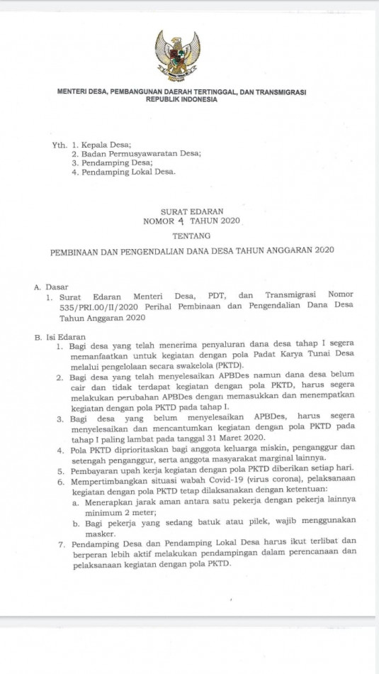 Ia juga mengatakan, bagi desa yang menyelesaikan Anggaran Pendapatan dan Belanja Desa (APBDes) namun dana desa belum cair dan tidak terdapat kegiatan dengan pola padat karya tunai, diharuskan segera merevisi dengan memasukkan dan menempatkan kegiatan dengan pola padat karya tunai pada tahap I.