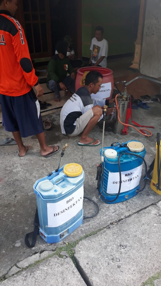 Penyemprotan kali ini menggunakan bio disinfektan tidak menggunakan cairan kimia dengan harapan bakteri yang disemprotkan bisa menetralkan jika ada virus covid-19.