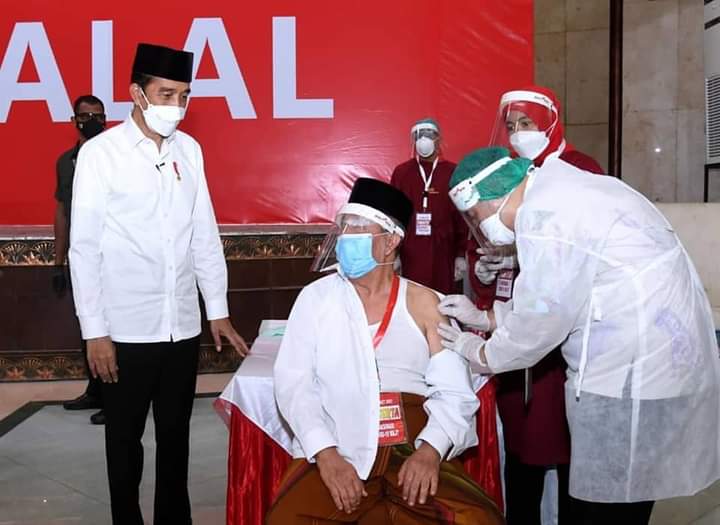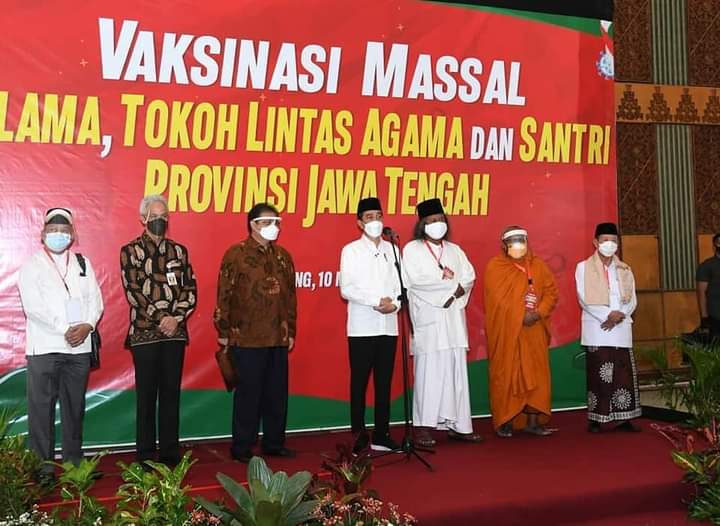 Semarang - Presiden Jokowi Tinjau Vaksinasi Massal bagi Ulama dan Tokoh Lintas Agama • Provinsi Jawa Tengah pada Rabu, 10 Maret 2021, menggelar vaksinasi massal bagi para ulama, tokoh lintas agama, hingga sejumlah santri pondok pesantren setempat. Vaksinasi massal tersebut dipusatkan di Masjid Agung Jawa Tengah (MAJT), Kecamatan Gayamsari, Kota Semarang.