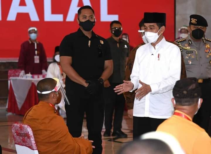Saat kedatangan Presiden tampak para ulama dan tokoh lintas agama yang tengah menjalani giliran vaksinasi di antaranya K.H. Ahmad Muwafiq, K.H. Ubaidullah Shodaqoh, Pdt. Erinchan Naibaho, Pdt. Tjahjadi Nugroho, Anak Agung Ketut Darmaja, Bhikku Dittisampanno Thera, dan Adi Pratikto (penghayat). Diskominfo Jateng