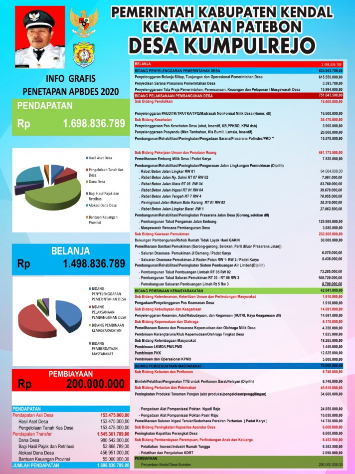 KUMPULREJO.DESA.ID - Desa Kumpulrejo Kecamatan Patebon Kabupaten Kendal melakukan pemasangan baliho Anggaran Pendapatan dan Belanja Desa (APBDes) di empat titik ruang terbuka Publik. Hal itu dilakukan untuk menunjukkan transparansi pengelolaan APBDes kepada masyarakat desa Kumpulrejo, Selasa (14/04/2020).