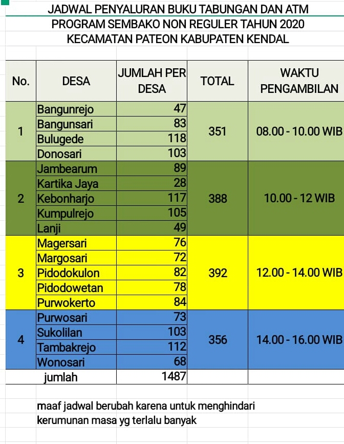 KUMPULREJO.DESA.ID – Bantuan sosial bagi masyarakat terdampak Covid-19 dari Kementerian Sosial RI mulai disalurkan. Melalui perluasan program sembako di Kecamatan Patebon sebanyak 1.487 keluarga penerima manfaat (KPM) di kecamatn Patebon dan akan mendapatkan Kartu Keluarga Sejahtera (KKS) yang berisikan uang saldo di rekening sebesar Rp 200.000 yang diisi oleh Pemerintah setiap bulannya selama sembilan bulan. Uang tersebut hanya bisa digunakan untuk membeli Sembako di e-warong (elektronik warung gotong royong) ataupun warung lainnya yang menjalin kemitraan dengan BTN. Pendistribusian perdana KKS ini dilakukan di aula kecamatan Patebon pada Rabu (13/5) pagi.