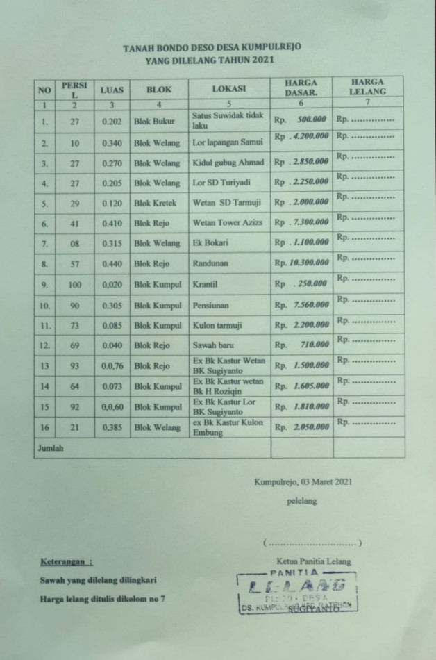 Sugiyanto selaku ketua panitia mengatakan bahwa ada 16 lokasi yang akan disiapkan untuk pelaksanaan lelang pada kali ini. berikut daftar tanah yang akan dilelang pada pelaksanaan besok. Harga dasar yang duterapkan sesuai dengan kesepakatan rapat sebelumnya yaitu harga dasar merupakan harga pemenang lelang tahuh lalu. ditambahakan juga untuk pajak PBB dibebankan pada peserta pemenang lelang.