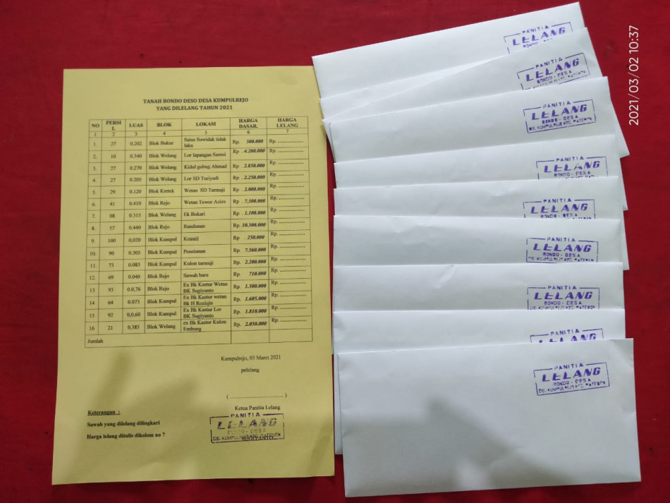 KUMPULREJO.DESA.ID – Jajaran Pemdes Kumpulrejo mengadakan rapat persiapan tahap akhir lelang bondo deso tahun 2021. Selasa 02/03/2021.